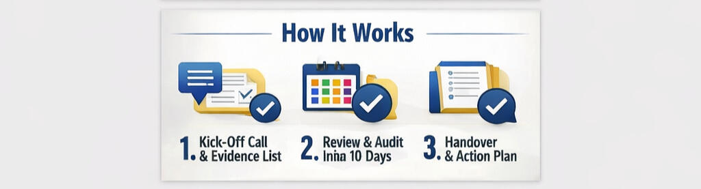 Gap review, evidence pack, priority audits, and a 30-day action plan.